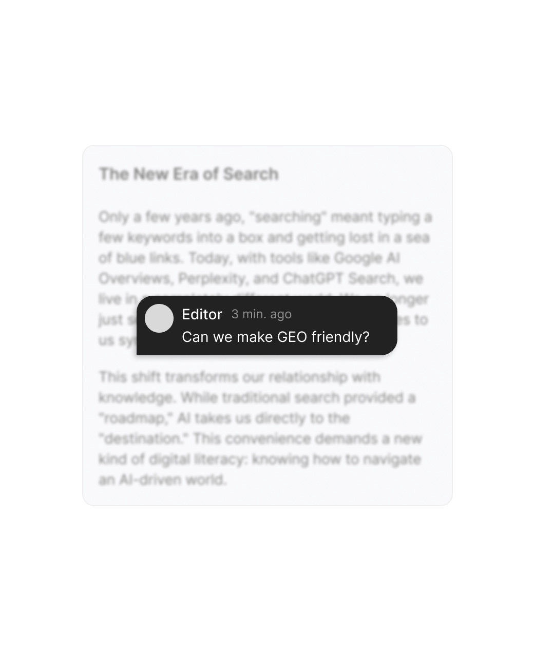 GEO is the practice of optimizing your brand's digital content so that AI-powered search engines like ChatGPT, Perplexity, Google AI Overviews, and Microsoft Copilot cite and reference your brand in their generated answers. It's the next evolution of search optimization, designed for an era where users get direct answers instead of a list of links.