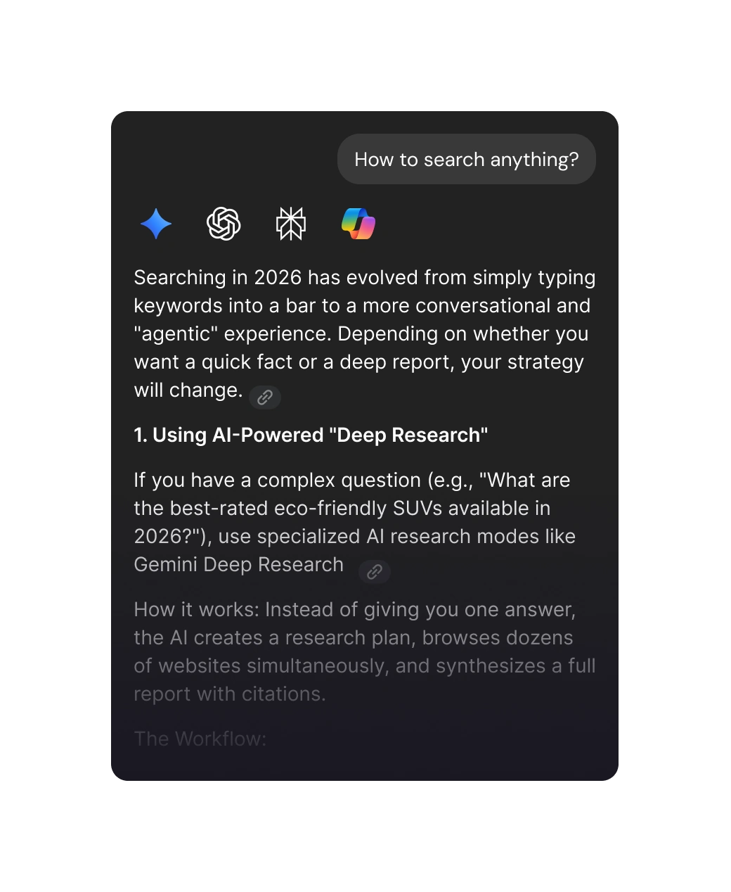 We test your brand across major AI engines, ChatGPT, Perplexity, Gemini, and Copilot, to understand how you're currently represented in AI-generated answers.