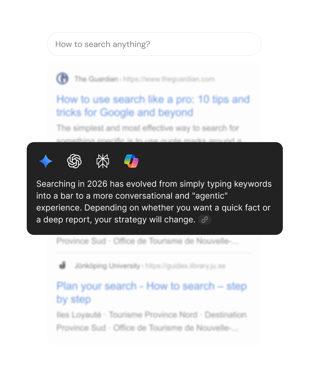 ChatGPT Search, Perplexity, Google AI Overviews, and Microsoft Copilot are now used by hundreds of millions of people. These platforms don't just retrieve pages; they read, understand, and generate answers. The sources they cite become the new "top of page one."
